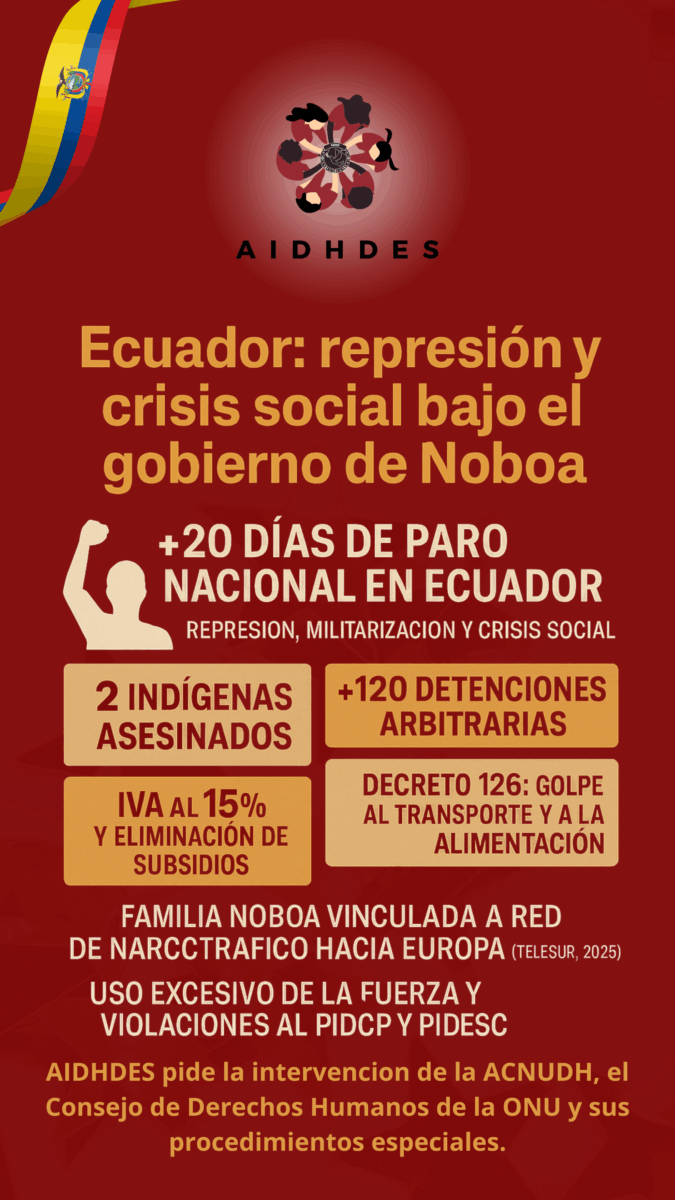 La Asociación Internacional de los Derechos Humanos y del Desarrollo Social (AIDHDES) emitió desde Ginebra un comunicado oficial en el que condena la grave crisis política, social y humanitaria que atraviesa la República del Ecuador, denunciando las políticas del presidente Daniel Noboa, así como sus presuntos vínculos familiares con redes de narcotráfico y la represión violenta contra manifestantes.