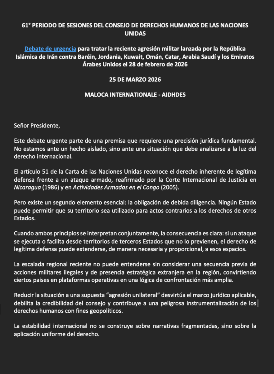 En este contexto, las intervenciones impulsadas por Maloca Internationale y AIDHDES introducen un elemento esencial en el debate contemporáneo y que tienen que ver con la necesidad de coherencia jurídica, igualdad soberana y aplicación no selectiva del derecho internacional como condiciones indispensables para la credibilidad del sistema multilateral.