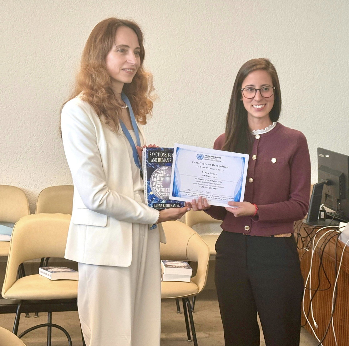 Prof. Andrea Dias Bolívar (derecha) recibe su premio por parte de la Relatora Especial de las Naciones Unidas, Prof. Alena Douhan.